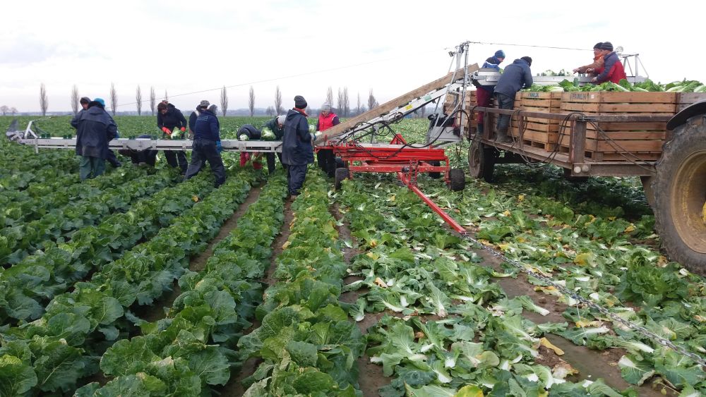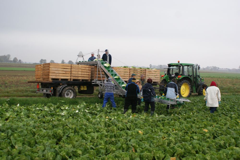 • Быстрая уборка овощей (100-120 паллет кочанной капусты). С транспортера сотрудники собирают овощи и укладывают их в ящики для поддонов или садовые ящики. Транспортер может автоматически